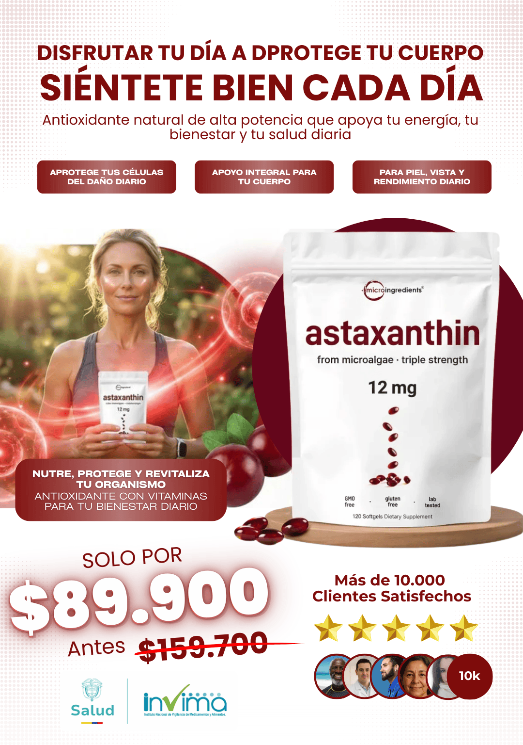 La astaxantina es un antioxidante natural que ayuda a proteger las células del estrés oxidativo y apoya el bienestar general como parte de una rutina diaria saludable.
