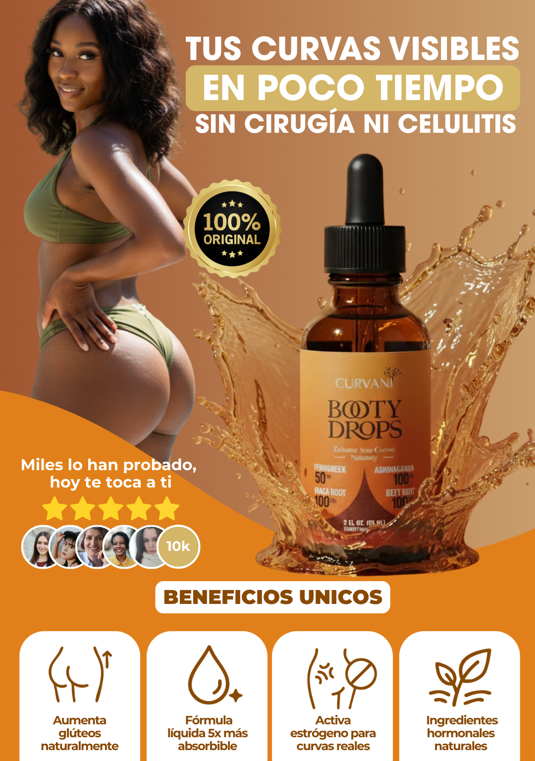 Booty Drops es un suplemento líquido diario con extractos herbales y superalimentos formulado para apoyar el equilibrio hormonal y ayudar a dirigir la grasa corporal hacia caderas y glúteos en lugar del abdomen.